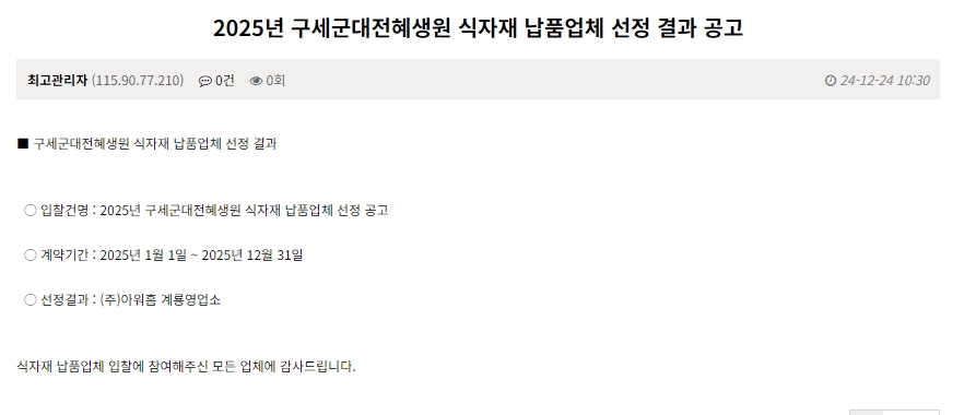 | 2025³â ±¸¼¼±º´ëÀüÇý»ý¿ø ½ÄÀÚÀç ³³Ç°¾÷ü ¼±Á¤ °á°ú °ø°í | |||