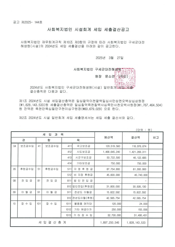 | 2024³âµµ »çȸº¹Áö¹ýÀÎ ½Ã¼³È¸°è ¼¼ÀÔ¡¤¼¼Ãâ °á»ê°ø°í, 2024 ÈÄ¿ø±Ý °á»êº¸°í | |||